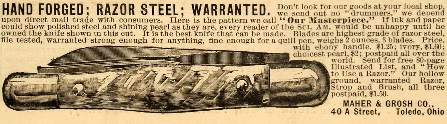 This is a tiny original 1898 black and white print ad for the Hand Forged Razor Steel from Maher & Grosh Company located at 40 A Street, Toledo, Ohio.