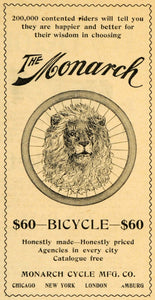 This is a small original 1898 black and white print ad for the Monarch Bicycle, a product by the Monarch Cycle Manufacturing Company.