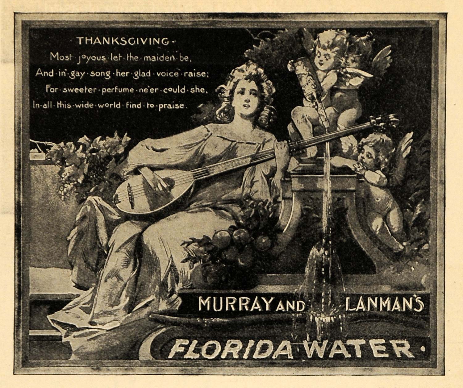 This is an original 1898 black and white print ad for Murray and Lanman's Florida Water. The ad features an image of a woman playing an instrument with cherubs around her.