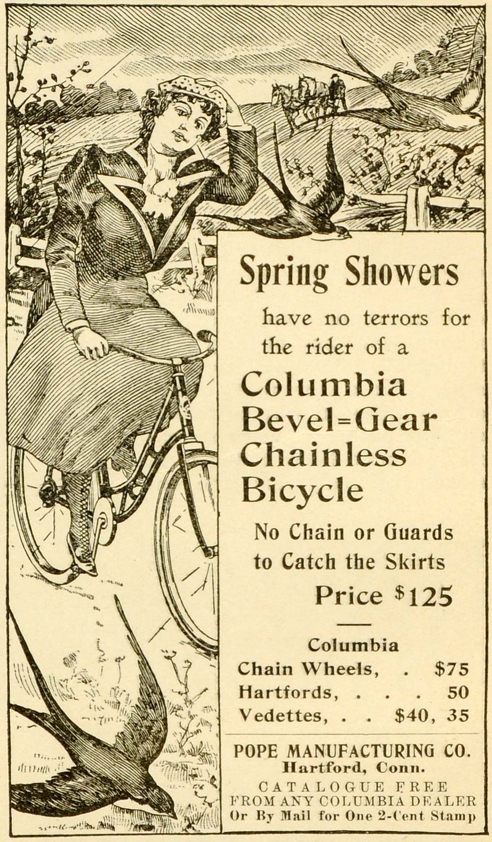 Keywords specific to this image: Antique Advertising, bike, biking, cycle, cyclist, cycling, woman, birds, countryside, field, road, transport, sparrows, dress, farmer, farming, plowman, plowing, bicycling, pricing, skirt, chain, guard