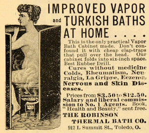 This is a small original 1898 black and white print ad for the Improved Vapor and Turkish Bath Cabinets from Robinson Thermal Bath Company located at 912 L. Summit Street, Toledo, Ohio.