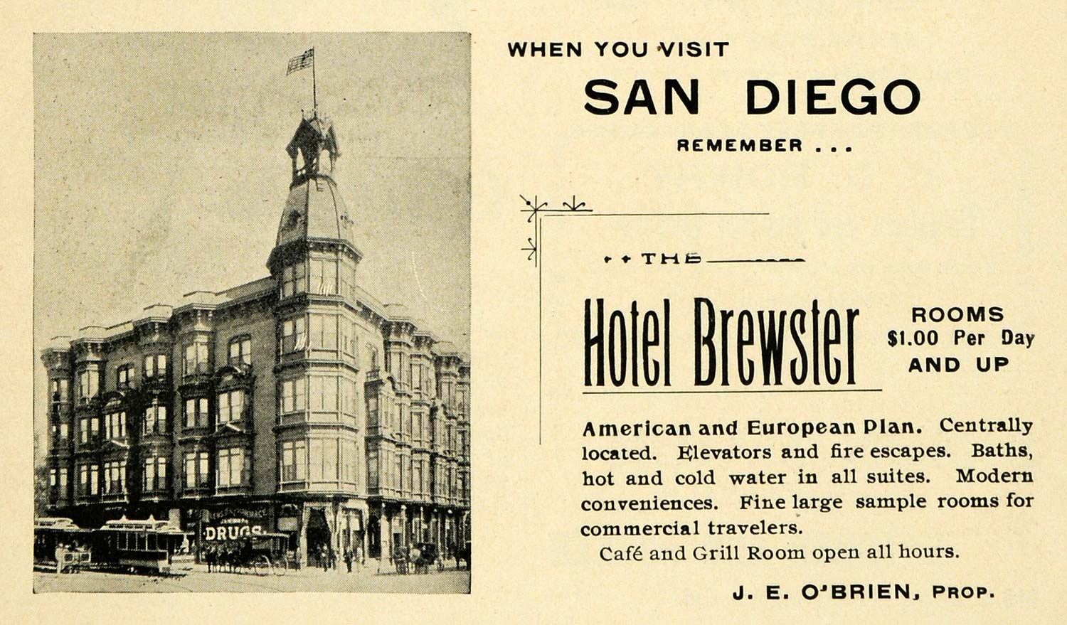 This is a small original 1898 black and white print ad for the Hotel Brewster in San Diego, California.