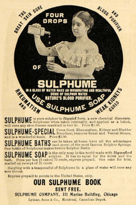This is an original 1898 black and white print ad for Sulphume from the Sulphume Company. The liquid was used to purify blood, strengthen kidneys, conquer rheumatism, and produce great skin.