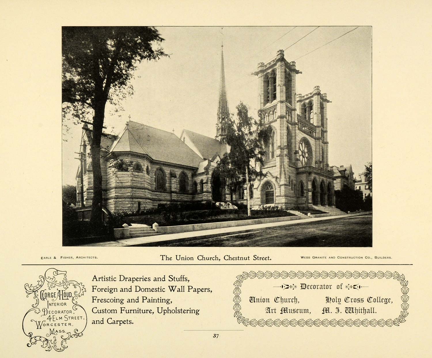 This is an original 1898 black and white print ad for George A. Loud, Interior Decorator, promoting artistic draperies, foreign and domestic wall papers, frescoing and painting, custom furniture, upholstering and carpets; located at 4 Elm Street, Worcester, Massachusetts. This ad features a halftone image of the Union Church, today known as the Union Congregational Church or the Chestnut Street Congregational Church, located at 5 Chestnut Street in Worcester, Massachusetts. Architects: Earle and Fisher. Builders: Webb Granite and Construction Company. This building is a historic Congregational church built in 1895 in a Gothic Revival style. In 1980, this site was added to the National Register of Historic Places.