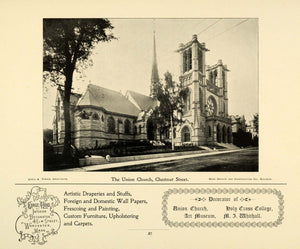 Keywords specific to this image: Antique Advertising, building, structure, architecture , Union Church, Holy Cross College, Art Museum and M. J. Whitmhall, interior design, home decoration