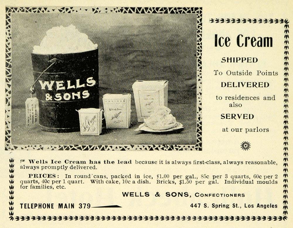 This is an original 1898 black and white print ad for Wells & Sons, confectioners and Ice Cream shippers., located at 447 S. Spring Street in Los Angeles, California.