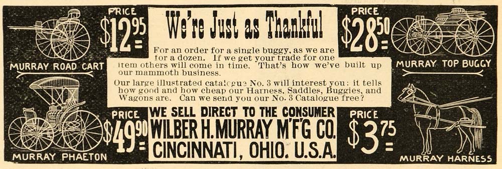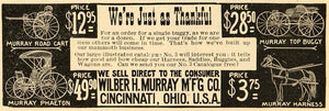 This is a tiny original 1898 black and white print ad promoting the Murray Road Cart, Murray Phaeton, Murray Top Buggy and Murray Harness from Wilber H. Murray Manufacturing Company located in Cincinnati, Ohio.