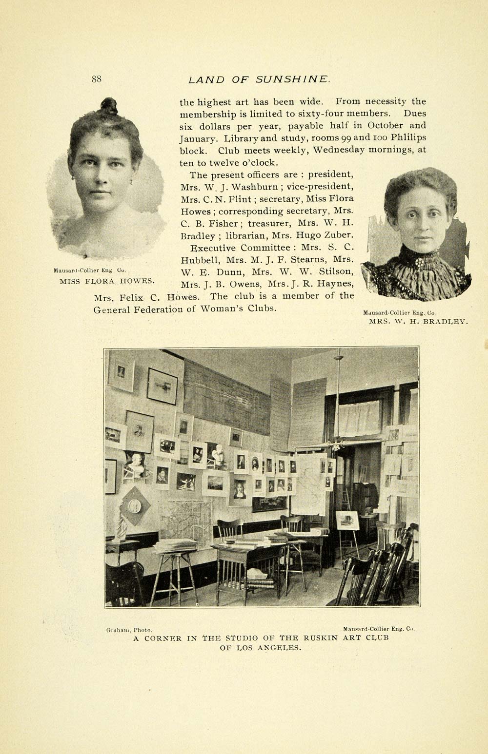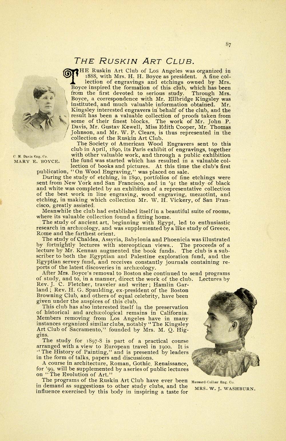This is an ultra rare original 1898 2-page article (one page, double-sided) entitled "The Ruskin Art Club". This article details the Ruskin Art Club of Los Angeles, California, and their helpers, Mary E. Boyce, Mrs. W. J. Washburn, Miss Flora Howes, and Mrs. W. H. Bradley.