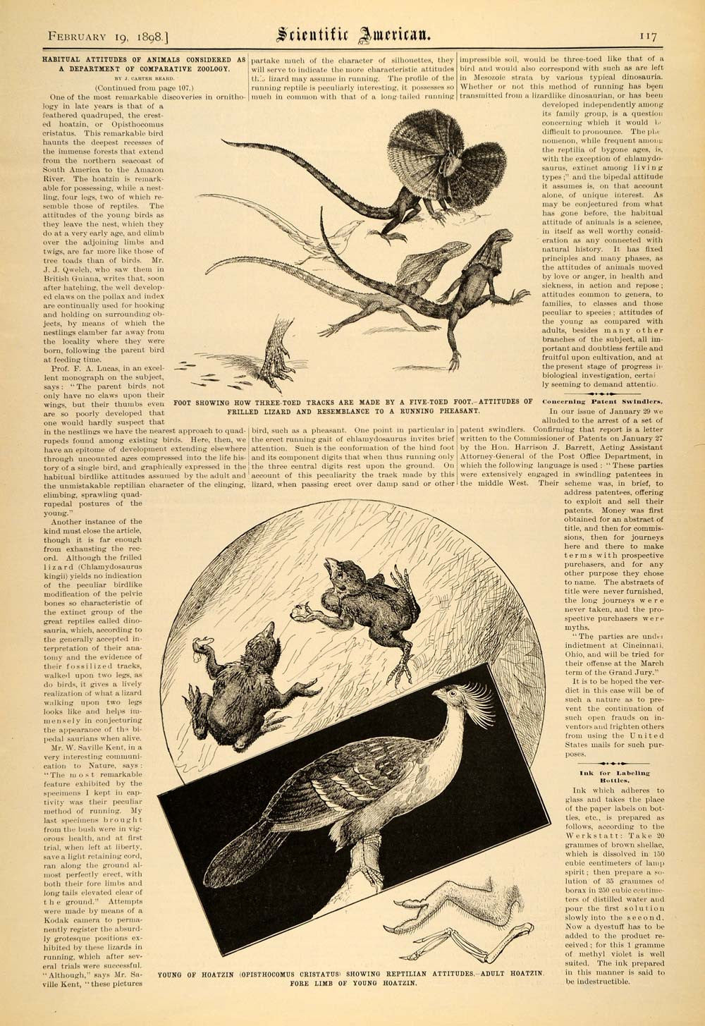 This is an original 1898 1-page article from the Scientific American Journal from February 19th entitled "Habitual Attitudes Of Animals Considered As A Department Of Comparative Zoology". This article details information about frilled lizards, Hoatzin birds, and the reptilian resemblance between them.