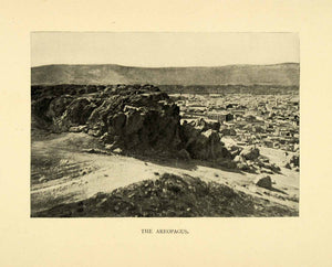 This is an original 1898 black and white halftone print of Areopagus in Greece. Areopagus means "Rock of Ares" and functioned as the high Court of Appeal for criminal and civil cases in Athens.
