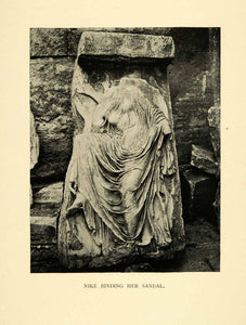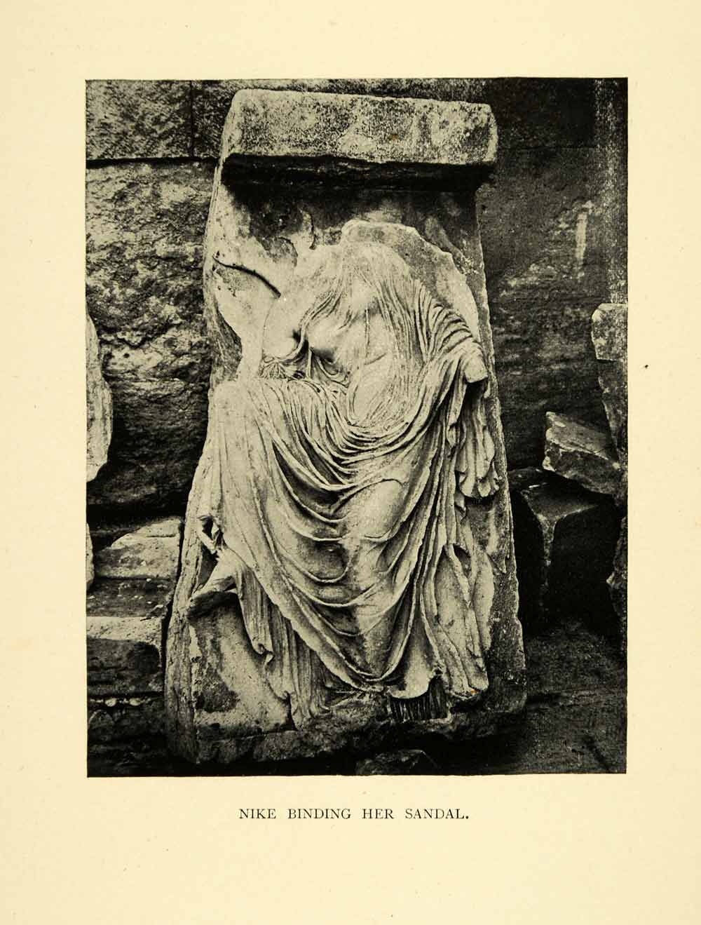 This is an original 1898 black and white halftone print of the Nike frieze, depicting her binding her sandal, from the Temple of Athena parapet on the Acropolis in Athens, Greece.