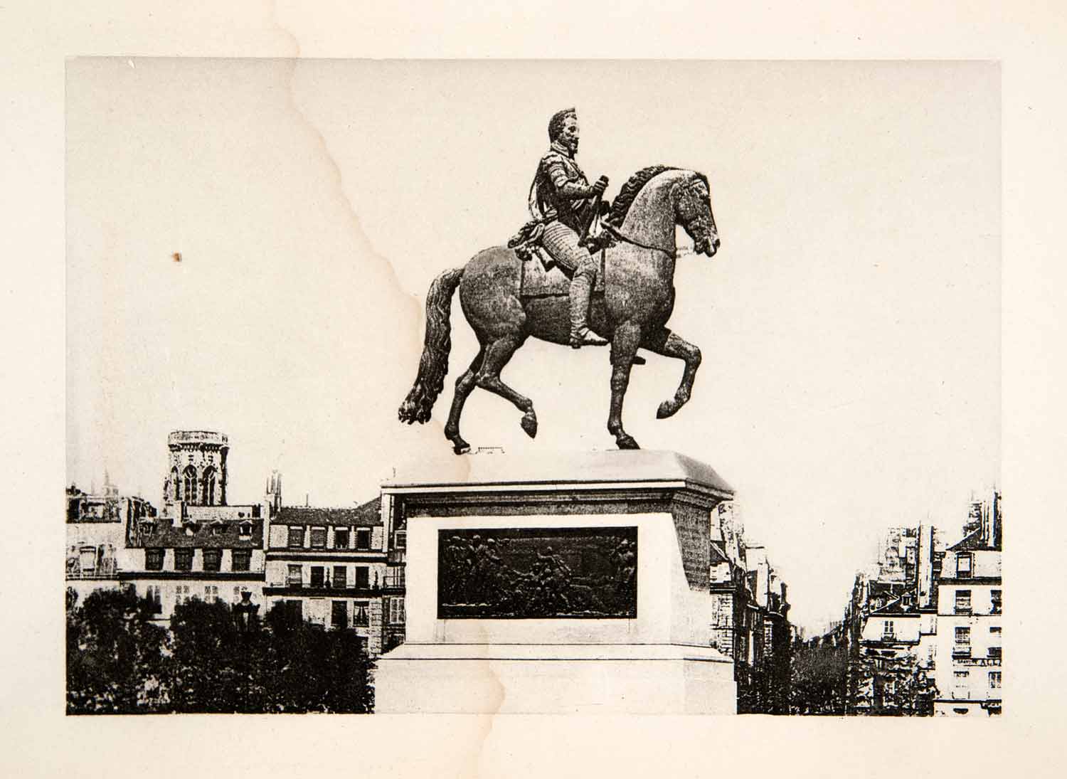 This is an original 1898 black and white photogravure of the statue of Henry IV in Paris, France.