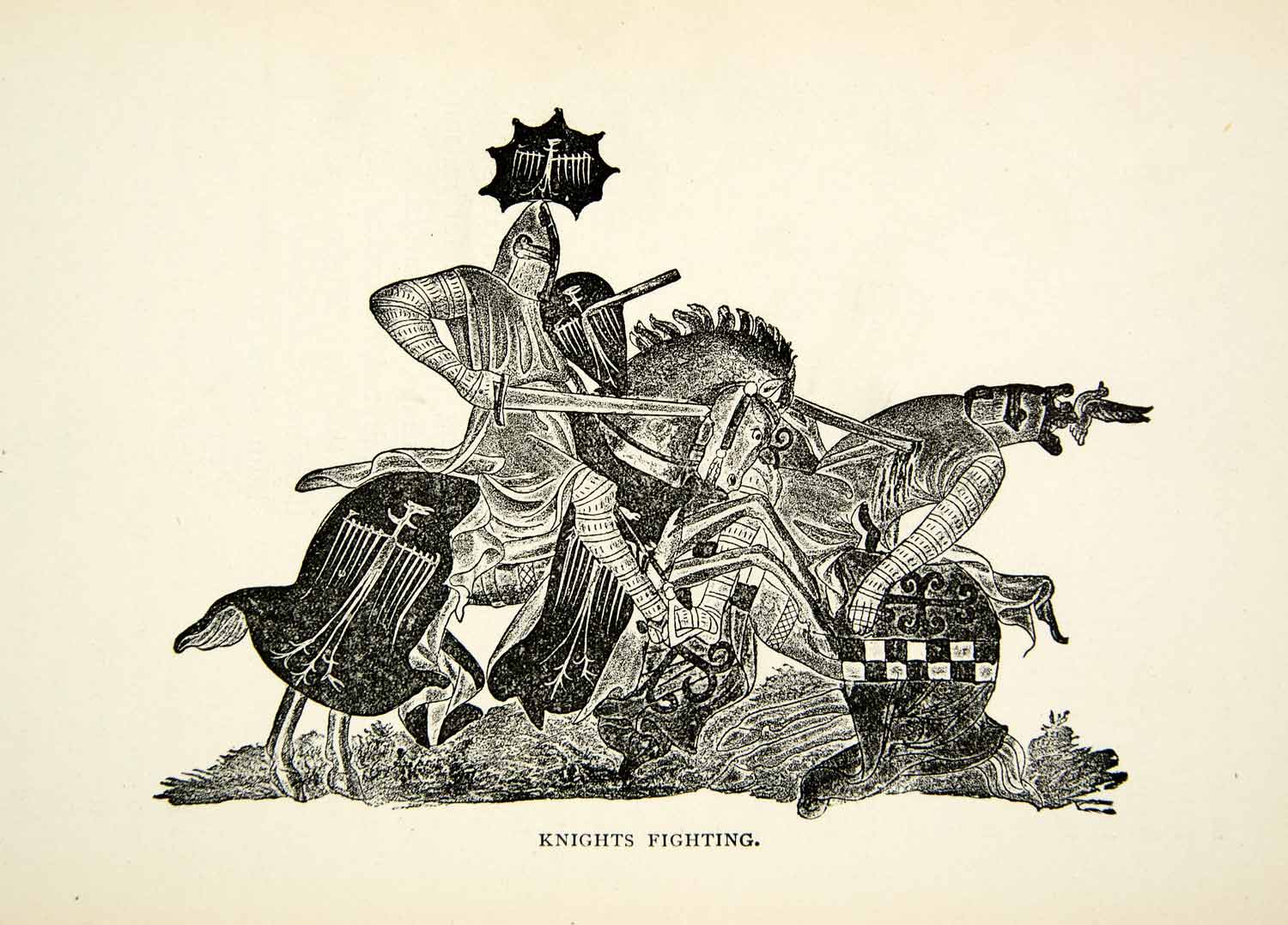 This is an original 1898 black and white relief line-block print of a pair of knights fighting during the crusades.