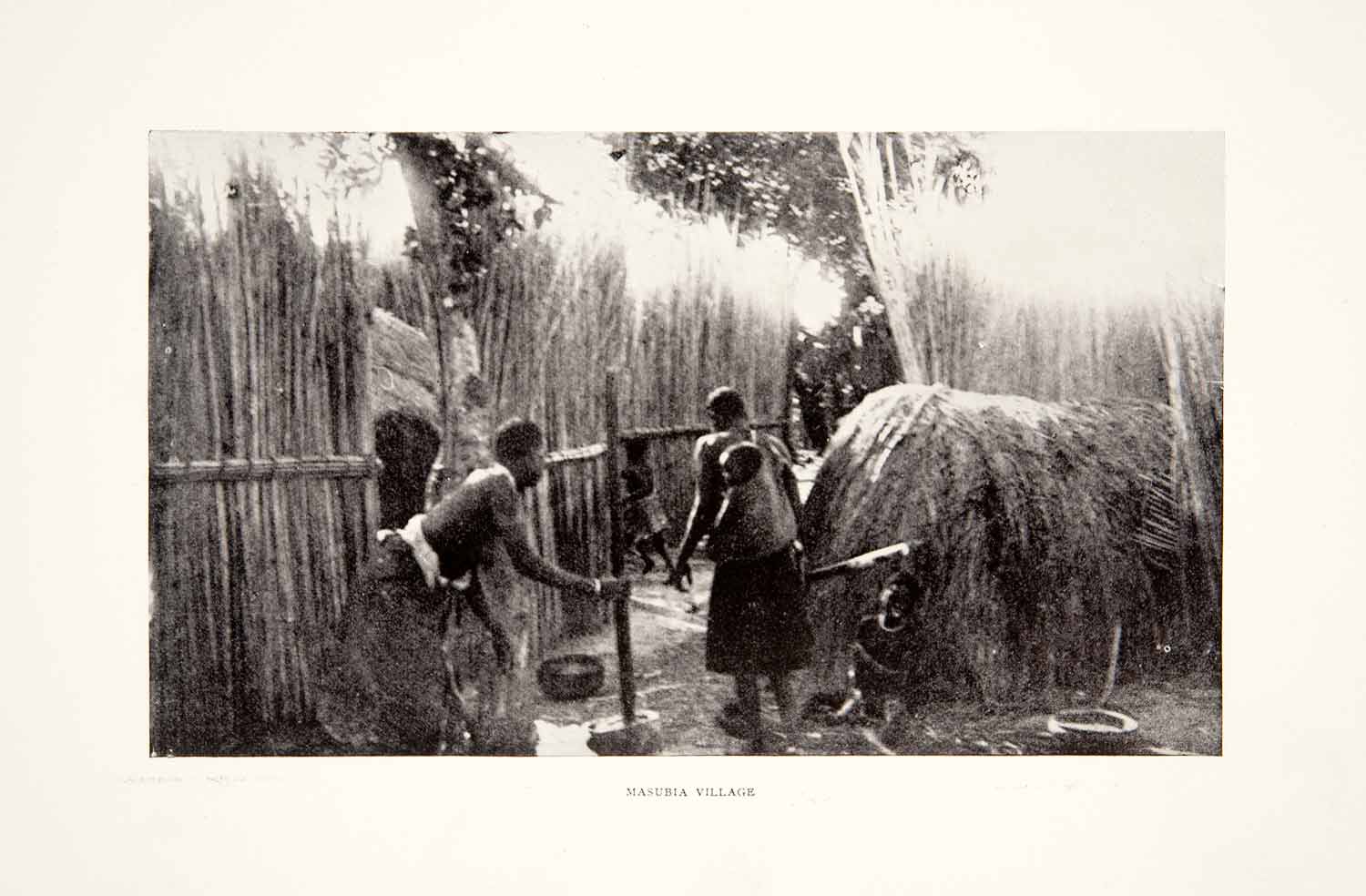 This is an original 1898 black and white halftone print of a Masubia village scene in Africa.