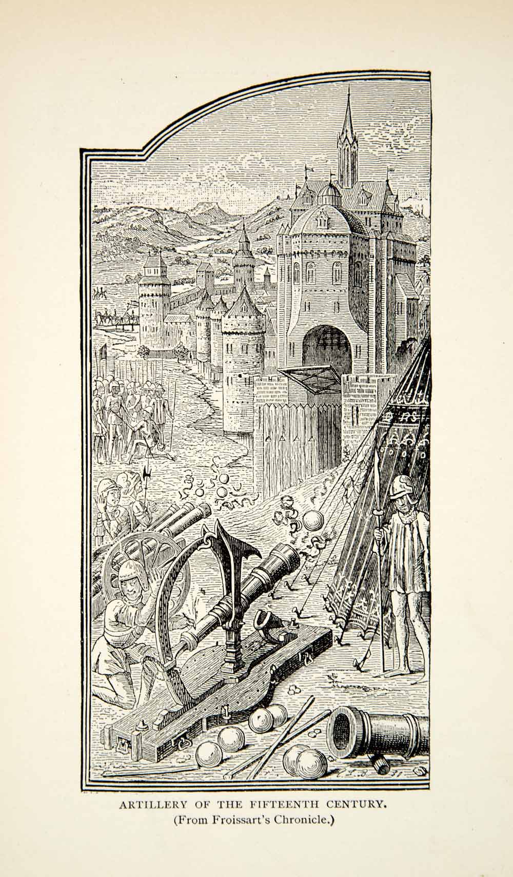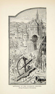 This is an original 1898 black and white relief line-block print of Medieval artillery being used during the siege of a castle in the Hundred Years War as recounted in Froissart's Chronicle.