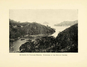 This is an original 1898 halftone print of the entrance to Nagasaki Harbor with a view of Papinberg in the distant center.