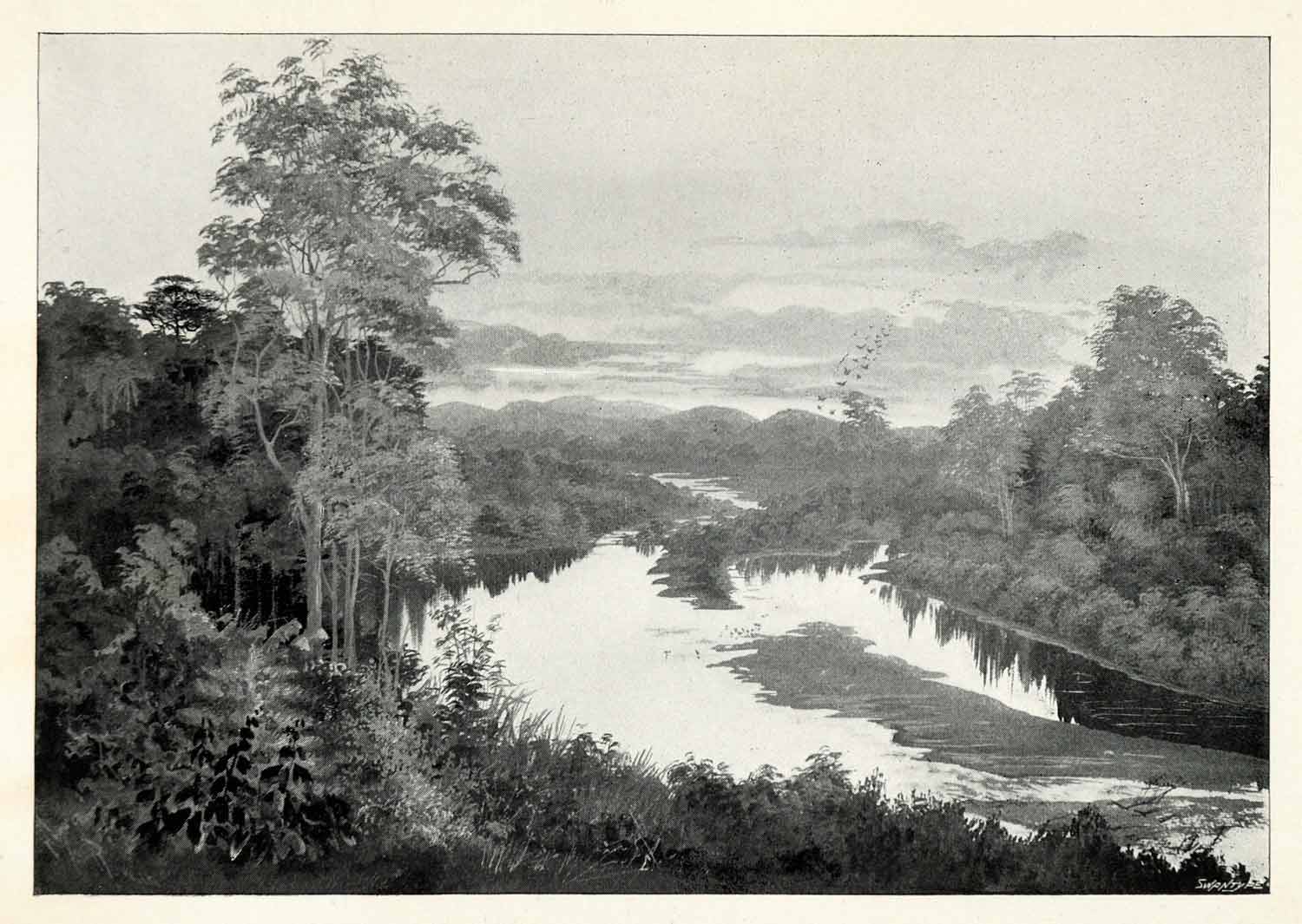 This is an original 1898 halftone print of "The Rocks," on Pioneer River in Mackay, Australia. Looks like a great fishing spot back then. Notice the flock of birds just off center in the distance. The reflection of the trees is so clear it feels as if you could walk down the hill and go fishing.