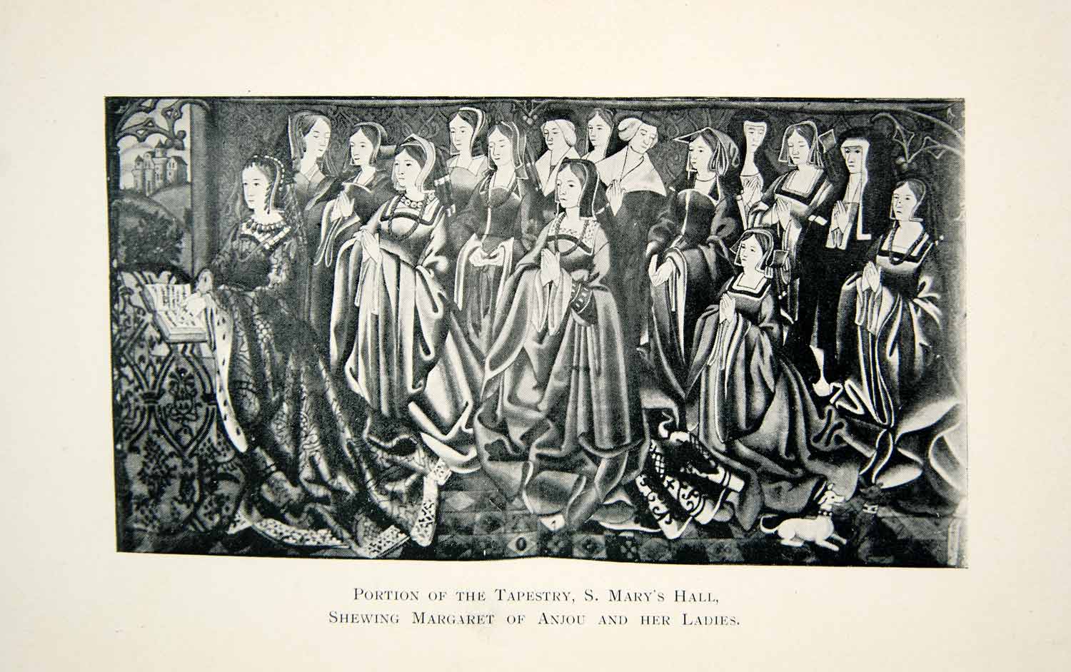 This is an original 1898 black and white halftone print of tapestry found at St. Mary's Guildhall in Coventry, England depicting Margaret of Anjou and her female attendants.