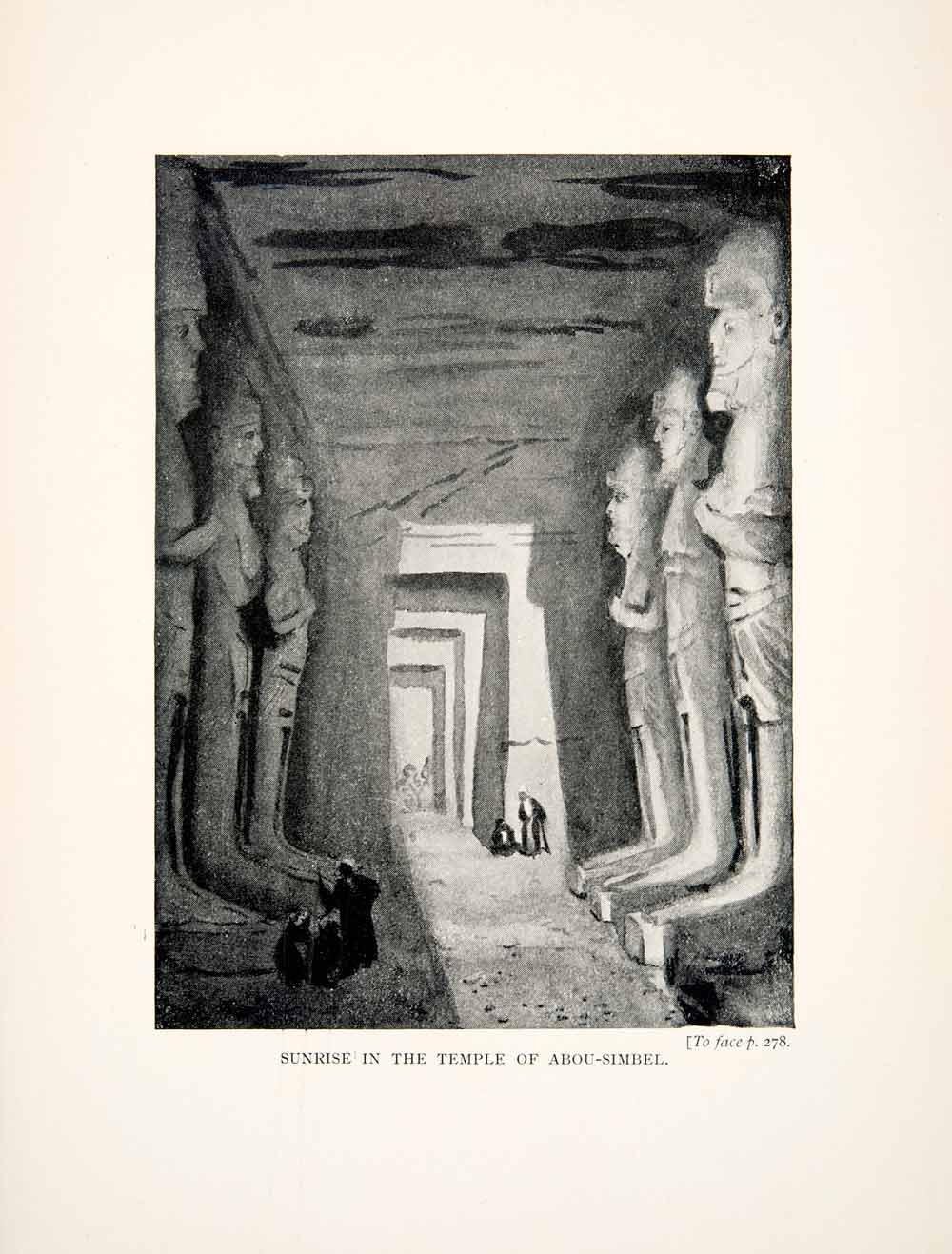 This is an original 1898 black and white halftone print of the sunrise in one of the temples of Abu Simbel of Nubia, Egypt. The monuments were relocated in 1968 based on the fact that they were settled on the banks of Nasser Lake; in order to avoid submerging the site after the construction of the Aswan High Dam reservoir, relocation was necessary for the ancient carvings. The site was built during Pharaoh Ramesses II's reign in honor of Nefertari, his wife, and himself, after the Battle of Kadesh.