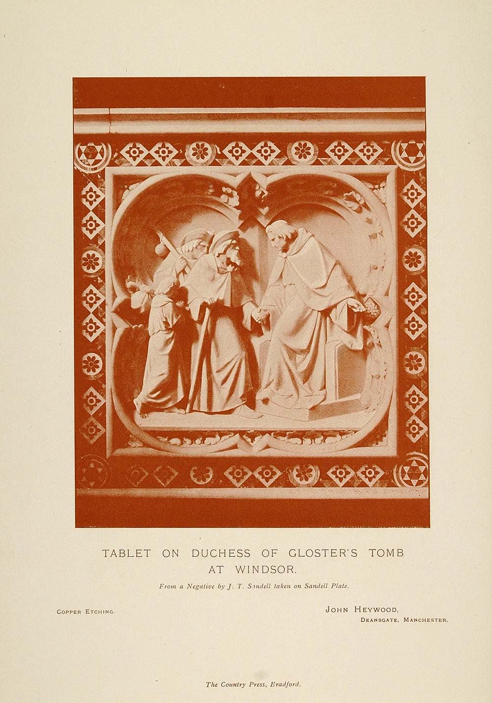 This is an original 1898 halftone print of the carving on the Duchess of Gloucester's (Gloster) Tomb in St. George's Chapel in Windsor Castle from a negative by J. T. Sandell. Copper etching. John Heywood. (Please note that there is printing on the reverse.)