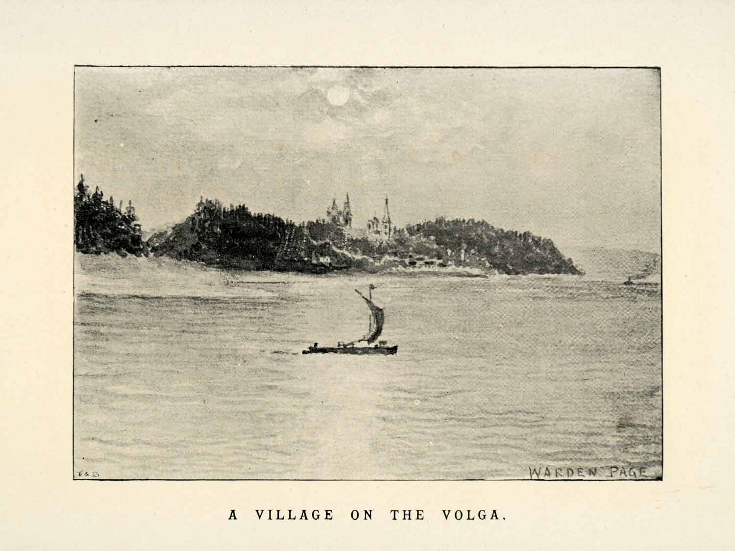 This is an original 1898 halftone print of a sailboat tacking along the Volga River in Russia. In the distance, towers from a village rise out of the dense forest growth.