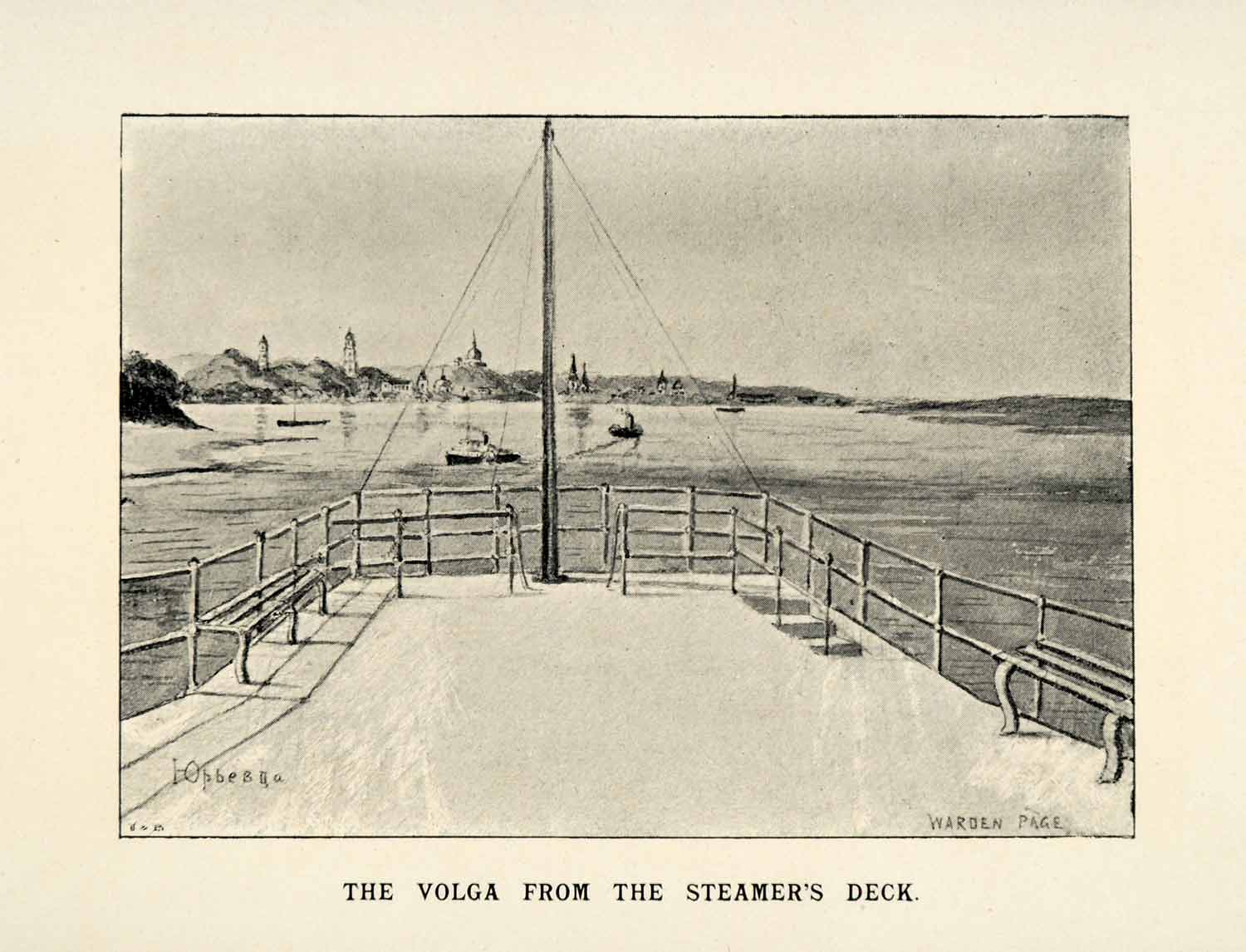 This is an original 1898 halftone print of the Volga river in Russia from the deck of a steamboat.