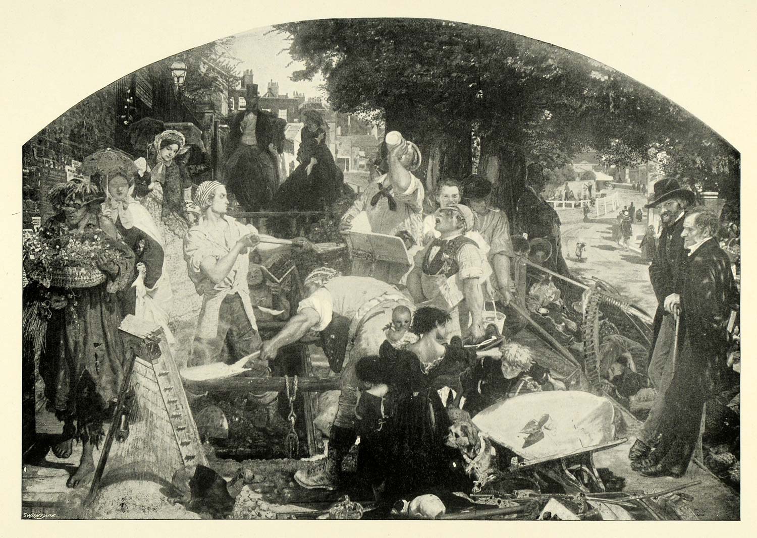 Keywords specific to this image: Historic, Baby, Crowd, People, Men, Women, Figures, Hustle and Bustle, River
