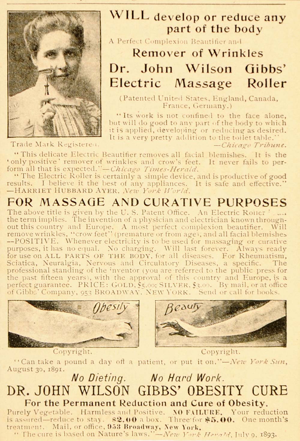 This is an original 1898 black and white print ad for the Dr. John Wilson Gibbs' Electric Massage Roller and Obesity Cure.