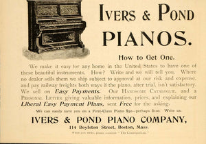 This is an original 1898 black and white print ad for Ivers & Pond Pianos from the Ivers & Pond Piano Company, 114 Boylston Street, Boston, Mass.