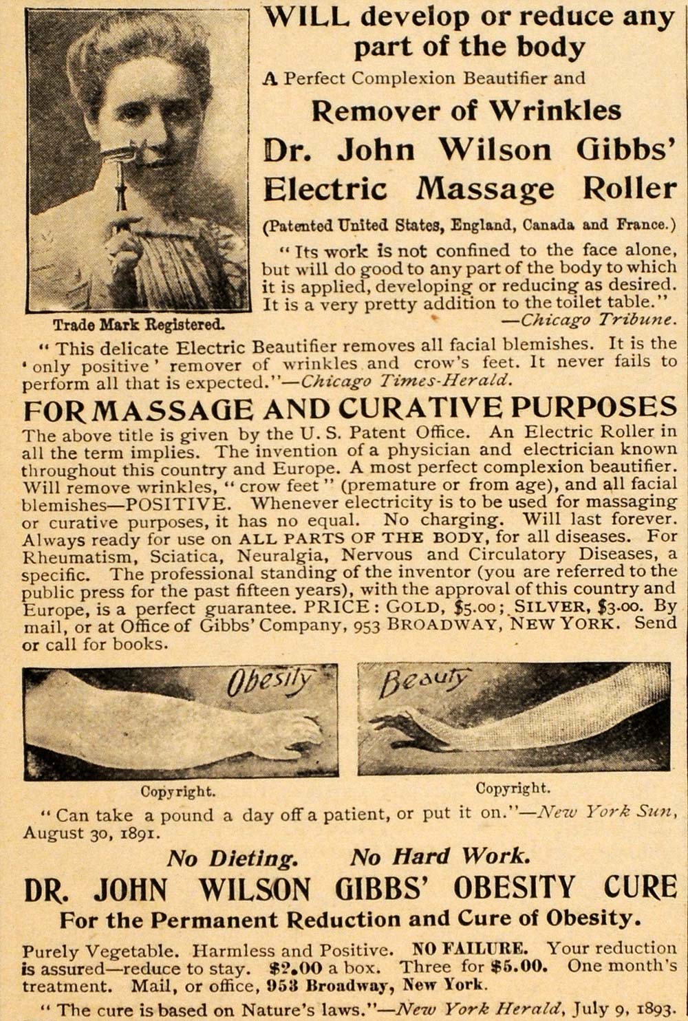 This is an original 1898 black and white print ad for Dr. John Wilson Gibbs' Electric Massage Roller and Obesity Cure.