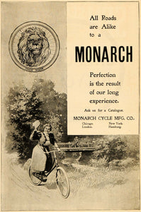 This is an original 1898 black and white print ad for the Monarch bicycle from the Monarch Cycle Mfg. Co. Great period illustration of a woman cyclist!