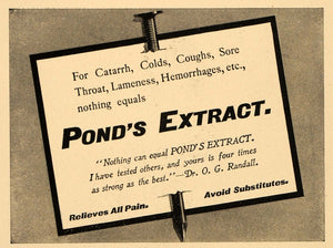 This is an original 1898 black and white print ad for Pond's Extract "For Catarrh, Colds, Coughs, Sore Throat, Lameness, Hemorrhages, etc."