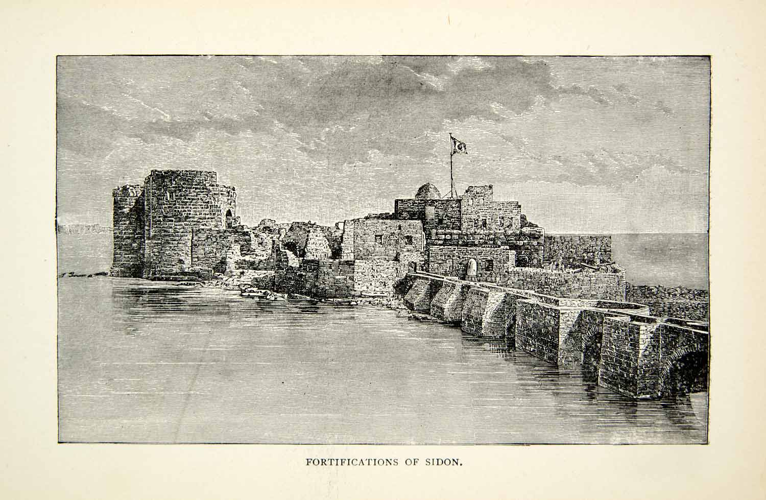 This is an original 1898 black and white in-text wood engraving of the Sea Castle in Sidon, Lebanon, which was built by the crusaders.