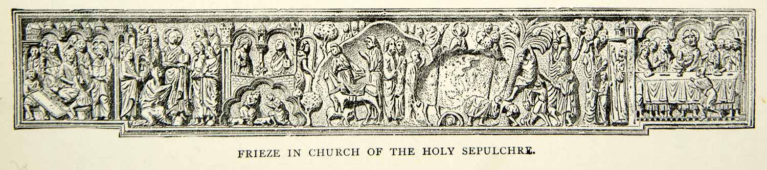 This is an original 1898 black and white in-text wood engraving of a frieze that was located in the Church of the Holy Sepulchre in Jerusalem.