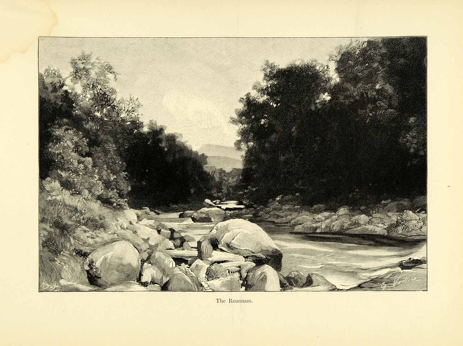 This is an original 1898 black and white wood engraving of the Reunnam River which is located in between Burma and Tibet.