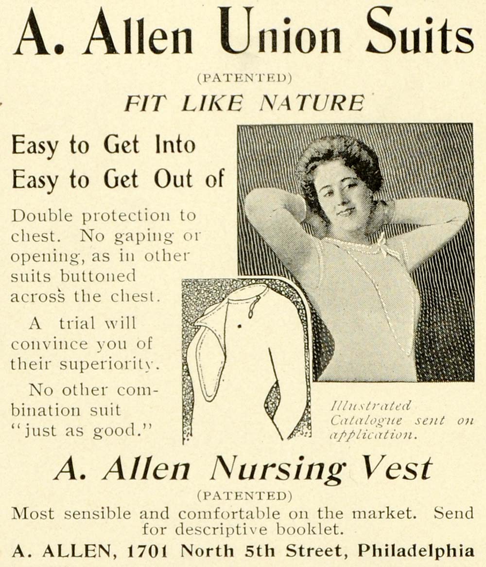 This is a small original 1899 black and white print ad for A. Allen Union Suits and Nursing Vests.