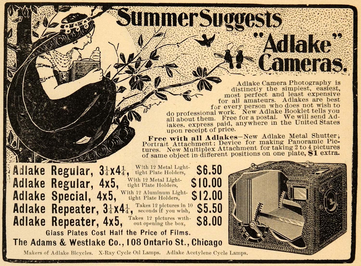 This is an original 1899 black and white print ad for the Adlake Camera Photography from Adams & Westlake Company located at 108 Ontario Street, Chicago, Illinois.