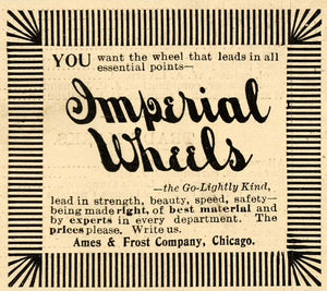 This is a small original 1899 black and white print ad for the Imperial Wheels from Ames & Frost Company located in Chicago, Illinois.