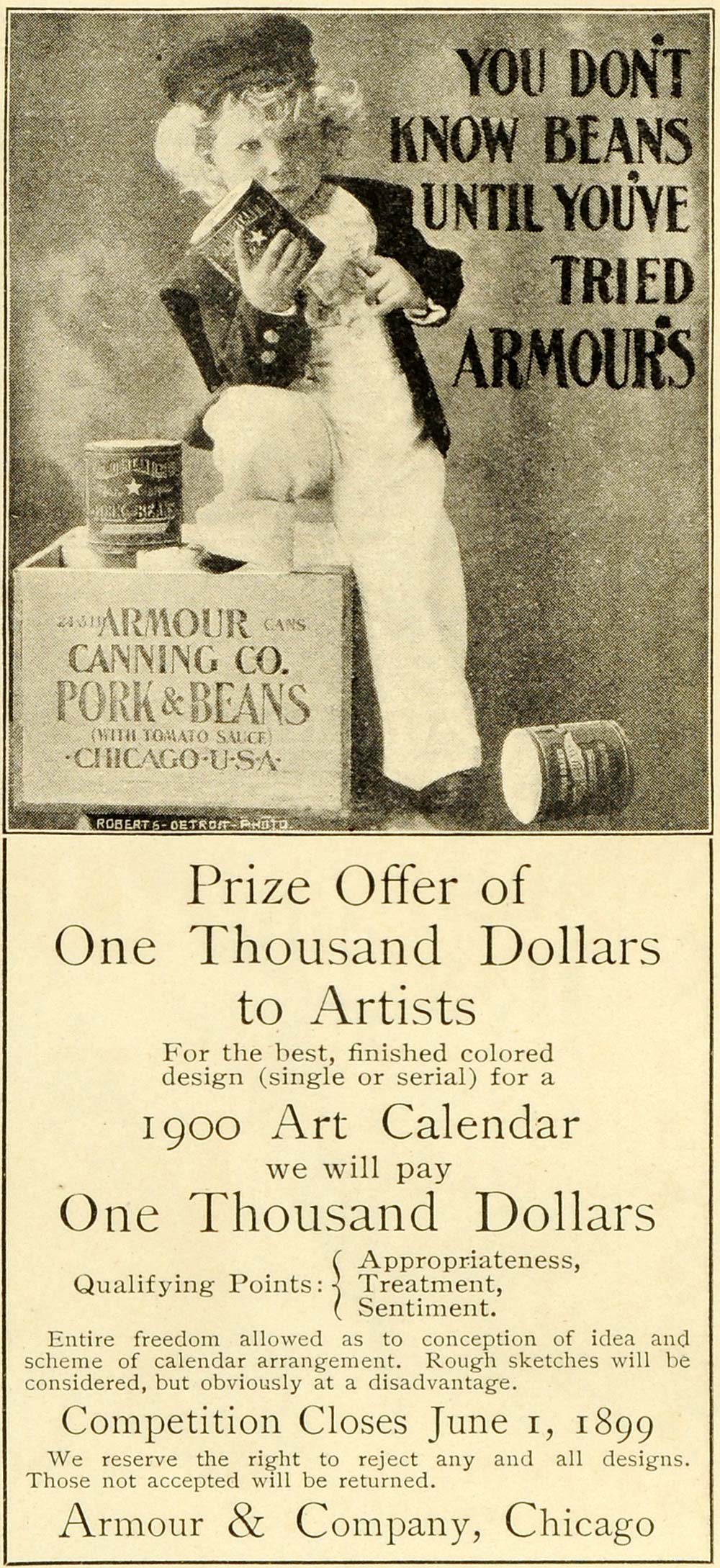 Keywords specific to this image: Antique Advertising, eat, eating, canning, can, crate, artist, contest, prize, art, calendar, competition, boy, child, kid, toddler, youngster, meal, meat