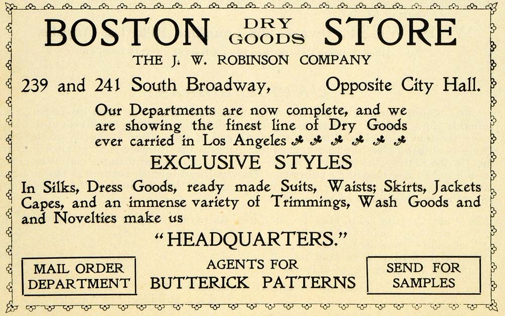 This is a small original 1899 black and white print ad for the Boston Dry Goods Store, affiliated with The J. W. Robinson Company, located at 239 and 241 South Broadway in Boston, Massachusetts.