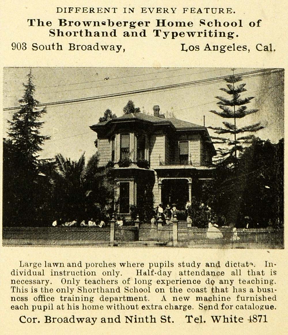 This is a small original 1899 black and white print ad for The Brownsberger Home School of Shorthand and Typewriting, located at 903 South Broadway in Los Angeles, California.