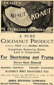 This is a small original 1899 black and white print ad for Pure Cocoanut Product for Shortening and Frying from the India Refining Co. located in Philadelphia, Pennsylvania.