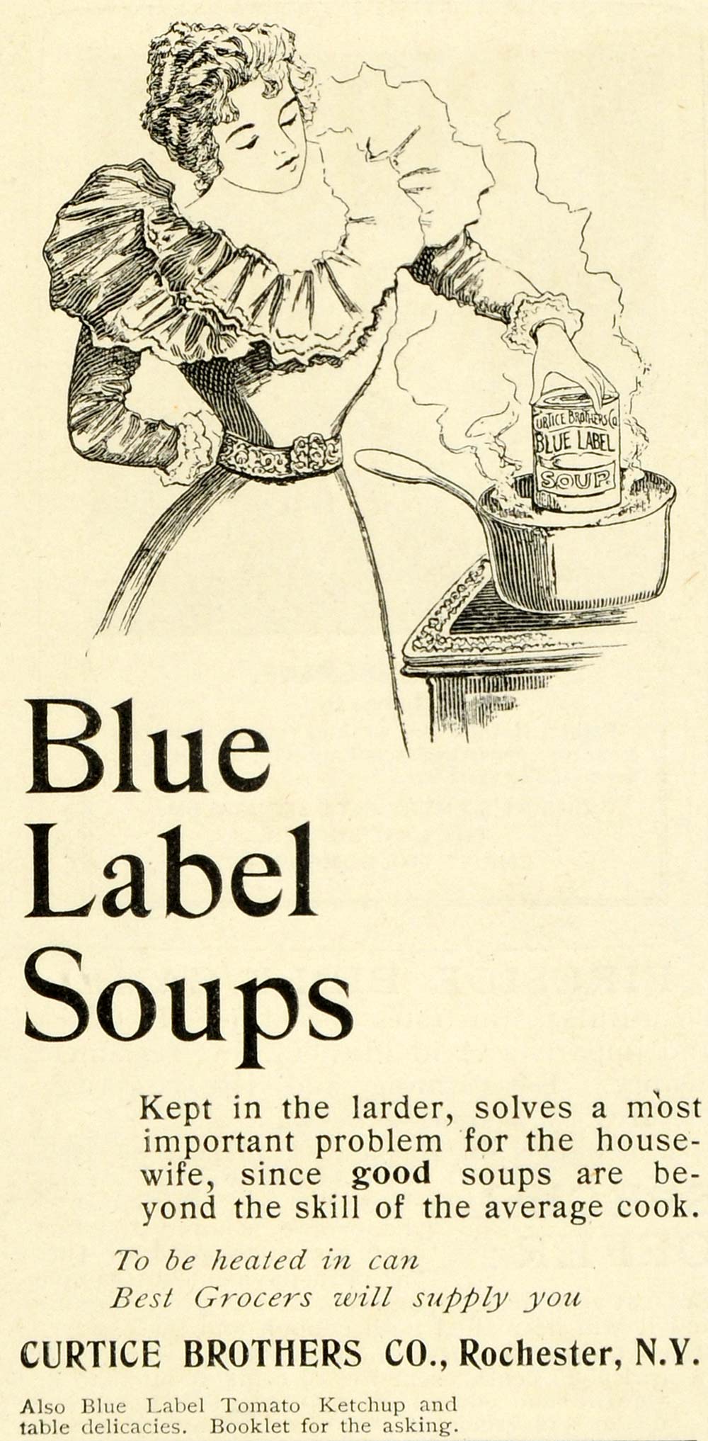 This is a small original 1899 black and white print ad for Blue Label Soups, a product line by the Curtice Brothers Company in Rochester, New York.