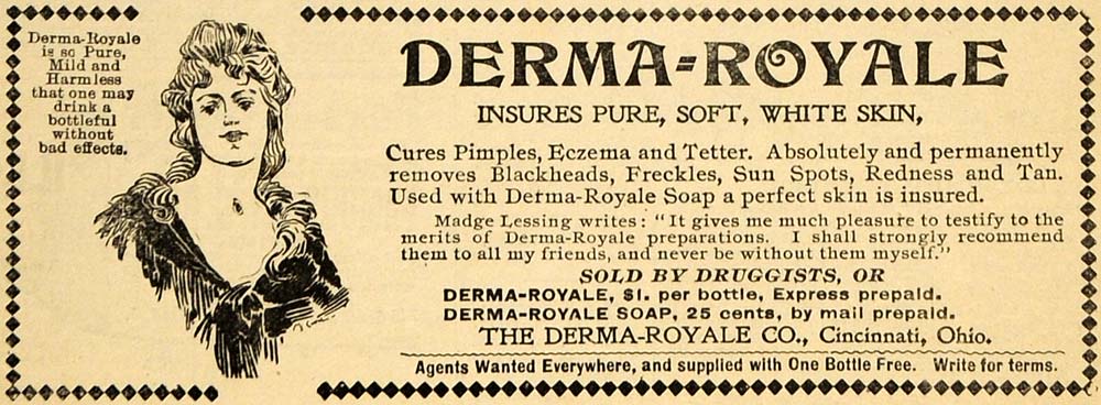 This is a small original 1899 black and white print ad for Derma-Royale treating pimples and eczema from Derma-Royale Company located in Cincinnati, Ohio.