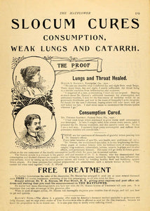 This is an original 1899 black and white print ad for treatment from Dr. Slocum. The ad writes, "Slocum Cures Consumption, Weak Lungs and Catarrh". The ad features quotes from Maggie S. Boswell of Enterprise, Georgia, and Mr. Thomas Sampson of Federal Point, Florida.