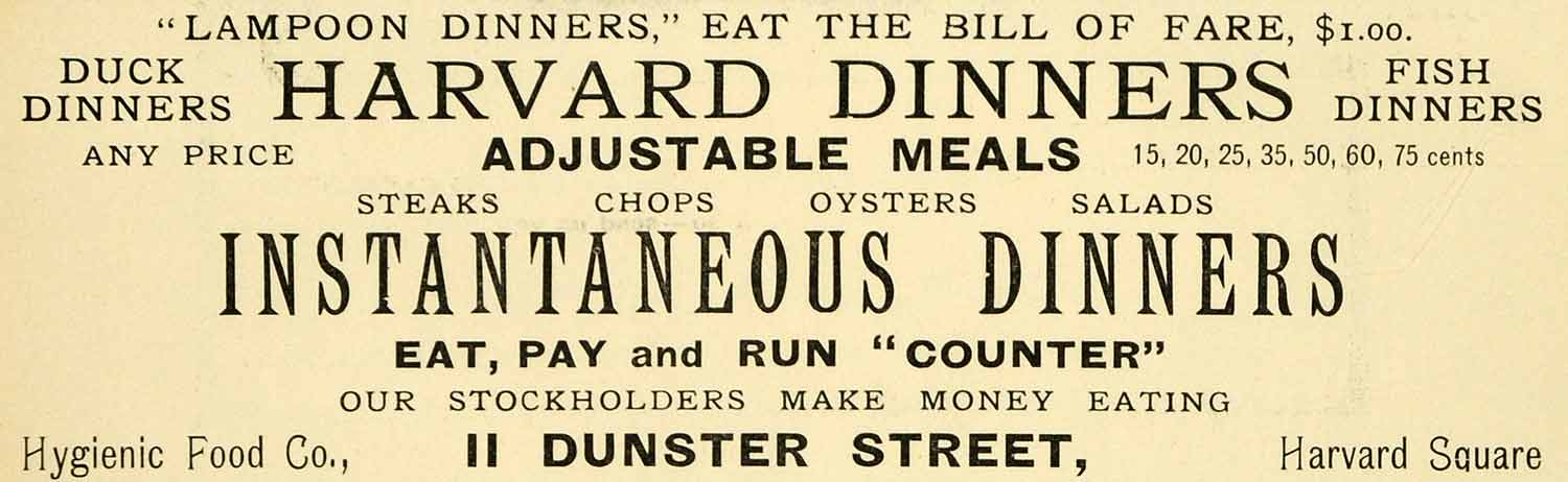 This is a small original 1899 black and white print ad for "Lampoon Dinners" at II Dunster Street, in Harvard Square, Cambridge, Massachusetts.