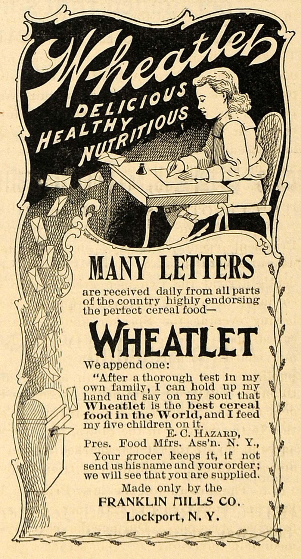 This is a small original 1899 black and white print ad for the Wheatley Breakfast Food from Franklin Mills Company located in Lockport, New York.