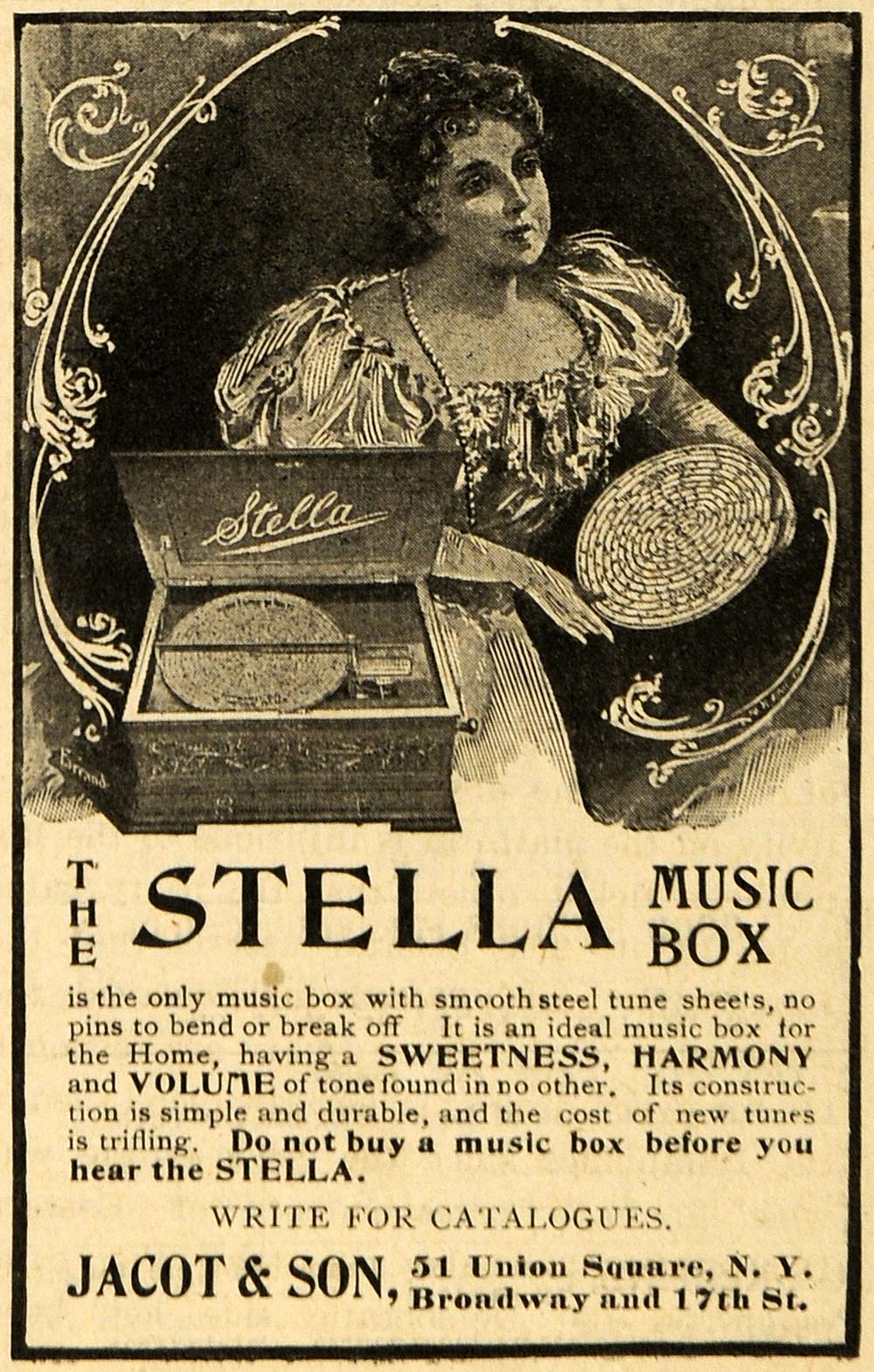 This is a small original 1899 black and white print ad for the Stella Music Box from Jacot & Son located at 51 Union Square on Broadway and 17th Street, New York.
