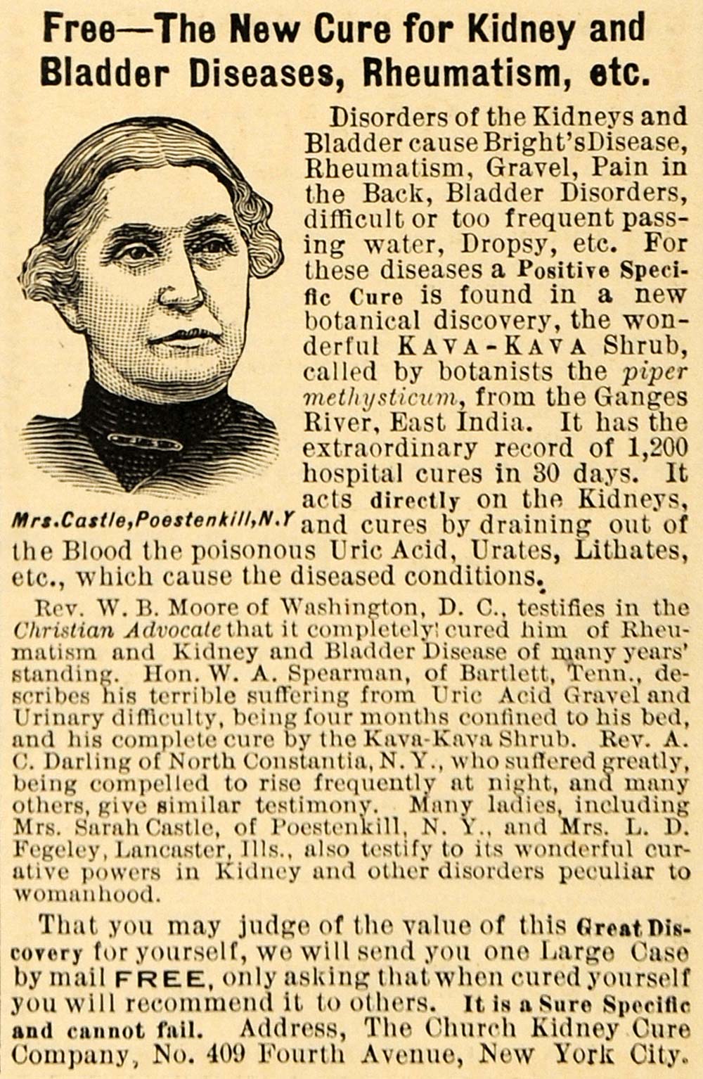 This is an original 1899 black and white print ad for the Kava-Kava Shrub called by botanists the pipe methysticum, from the Ganges River in East India. It will cure kidney and bladder disease, rheumatism, etc. This cure is by The Church Kidney Cure Company located at No. 409 Fourth Avenue, New York City.