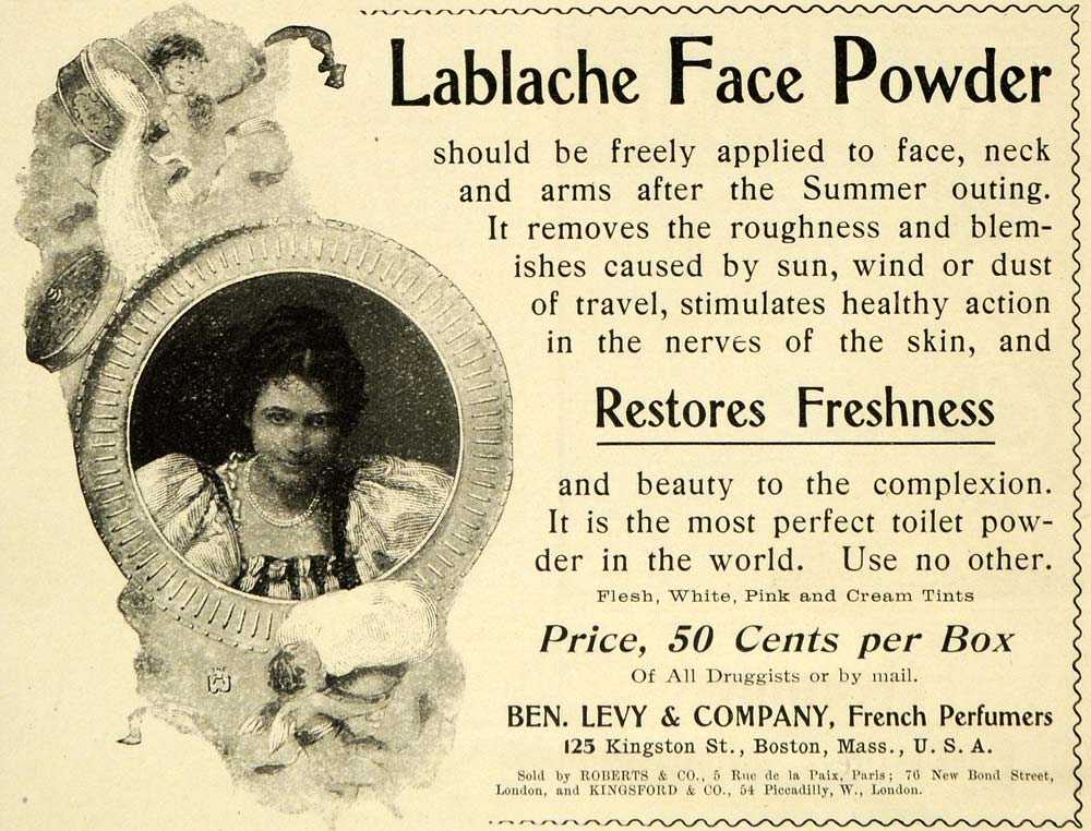 This is an original 1899 black and white print ad for Lablache Face Powder, a product line by Benjamin Levy and Company, French Perfumers located at 125 Kingston Street in Boston, Massachusetts.